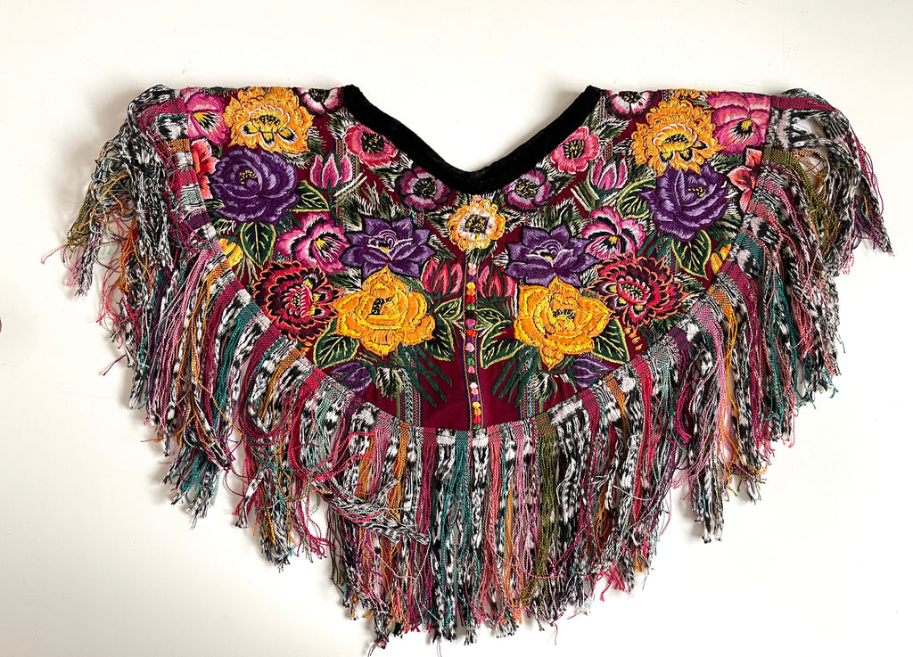 Huipil fringed collar poncho that can be worn or used for home decor.